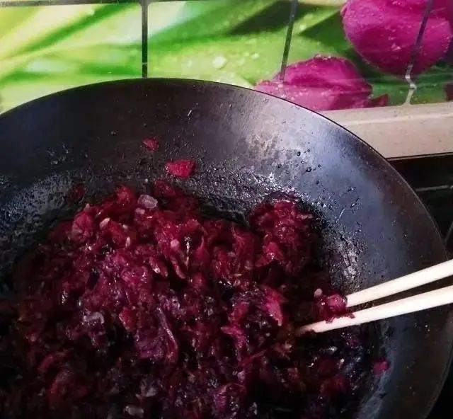 之后倒上白砂糖用双手搓,搓到玫瑰花发紫发黑,锅中加适量清水,加入白砂糖融化,小火慢慢熬,等到糖完全融化后关火。倒入搓好的玫瑰花翻拌均匀,之后倒入容器里晾凉,再加入一勺蜂蜜搅拌均匀,之后密封在玻璃瓶中十天左右即可。