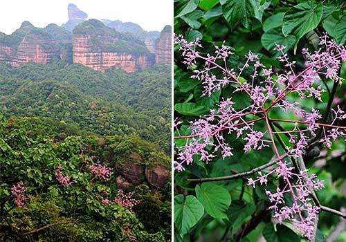 丹霞梧桐是丹霞地貌的特有物种,主要分布在岩壁的石缝中及山谷的浅土层中,多有小石积、金针花、还魂草、石蒜等伴生植物。由于受分布区狭小、人为破坏等因素的影响,现存株数不多,1987年在丹霞山初次发现时,数量还不到100株,处于濒危状态,现在它已被定为国家珍稀濒为植物和二级重点保护保护野生植物,MAIGOO小编觉得十分可惜。每年五六月份,丹霞梧桐花成片开放,美艳如画,但是由于丹霞梧桐植株十分稀少,即使在丹霞山也不是随处都能看到这一胜景。