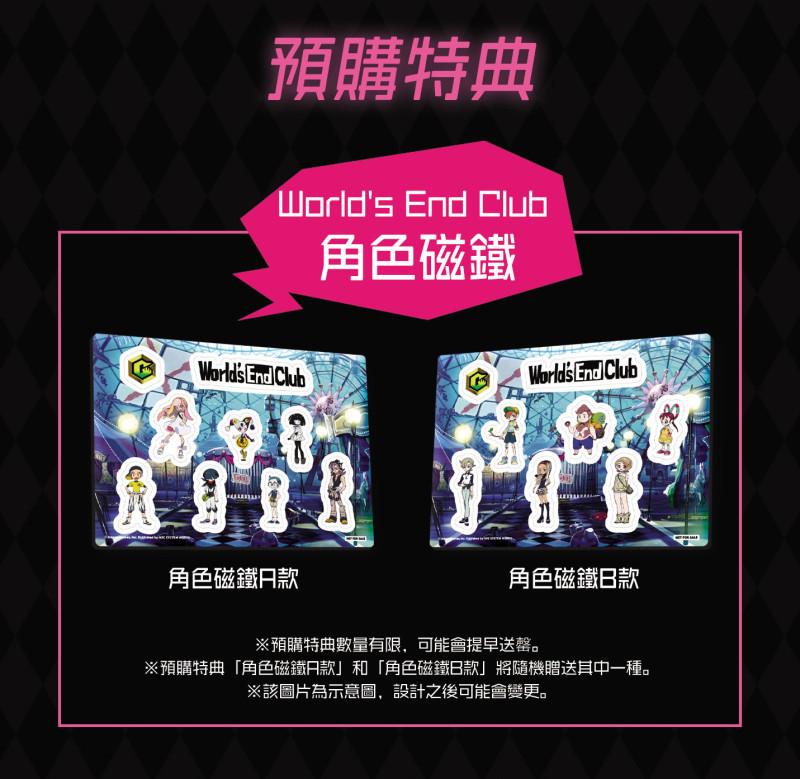 《世界尽头俱乐部》中文实体盒装版目前在各游戏店家的网路及实体通路进行预售中,预售日至 5 月 25 日(二)为止,预购特典将赠送「 世界尽头俱乐部 角色磁铁」。
