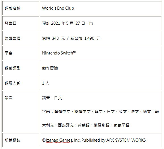 关于《世界尽头俱乐部》中文实体盒装版的详细资讯可以透过亚克系统(ARC SYSTEM WORKS)亚洲分店的官方网站及粉丝专页得知。