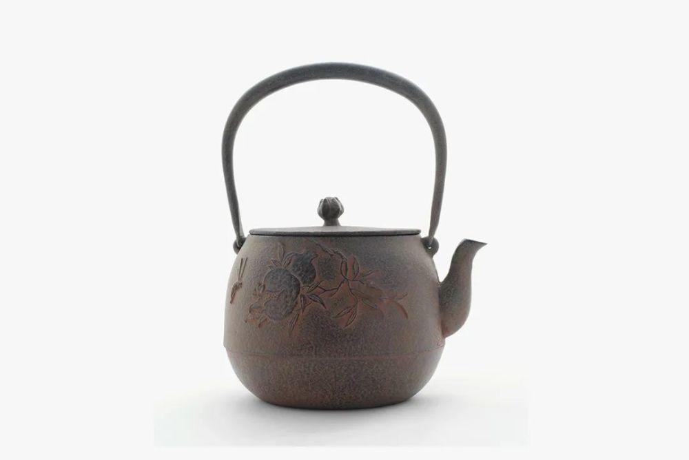 这件铁壶装饰有石榴图案,象征着子孙繁荣。铸造时每次都使用新的模具,因此每件作品上的石榴花、被石榴花引来的蜜蜂的图案都表现得十分精美。