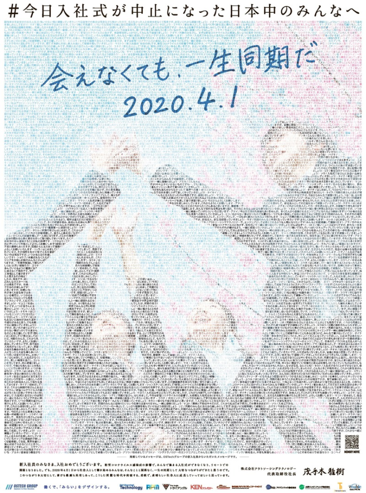 2020年4月1日这天,株式会社アウトソーシングテクノロジー(外包技术有限公司)为这届因疫情而无法举办入职仪式的员工们组织了一个特殊的仪式,将当天的报纸作为了同期职员齐聚一堂的载体,为员工们创造了能铭记一生的报纸广告活动。