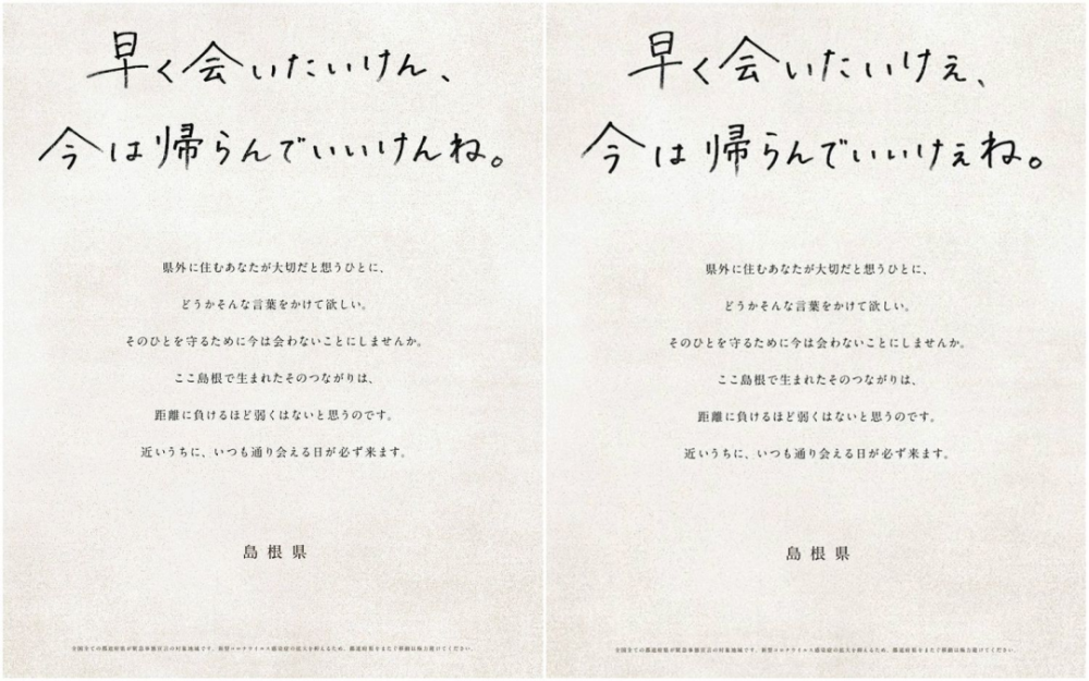 年初因疫情的肆虐,日本诸多地区都限制回乡省亲。岛根县则发布了一份印有通用语和方言版的“正因为想与你早日见面,所以现在不能见面”日文报刊,亲切的乡言和如家人般温柔的劝慰舒缓了被困于外地的异乡人焦虑不安的心。