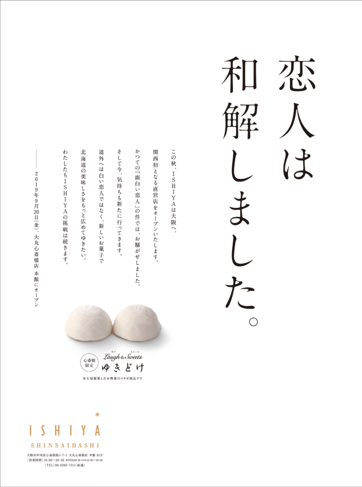 但到了2019年,石屋制果与吉本兴业不仅和解,还携手合作了一款名为“Laugh&Sweets ゆきどけ”(ゆきどけ=雪融)的糕点,怪不得是“恋人已经和解了”!幽默风趣的自嘲在了解其中渊源的的人们之间迅速热传。