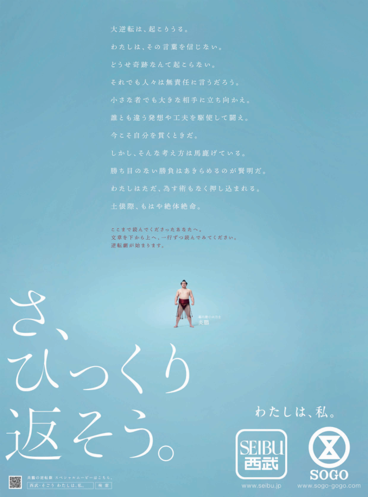 年初的疫情让许多日本杂货店濒临倒闭,在一派萧条环境下,崇光·西武元这个老牌杂货店刊登了一则名为“来吧,倒过来吧”的11行小诗,正读是绝望和悲观,而倒读是充满了希望和信心,这首诗如同黑夜中的灯塔照亮当时在困境中的百货业人,鼓舞他们去勇敢的面对困境。