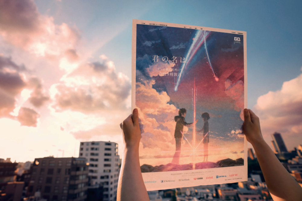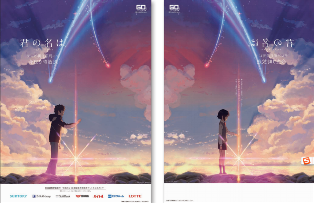 《你的名字》电影上映的当天,朝日电视刊登了一页正反两面的广告,当将报纸对着光时,利用纸质报刊特有的穿透性,便能看到泷和三叶能跨越时空相遇。