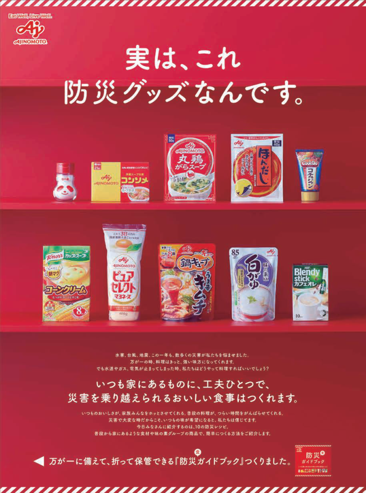 霓虹岛国作为地震高频高危地区,对于防灾知识的宣传可毫不马虎!味之素公司就将报纸变成了一册“防灾食品指南”,介绍了10种在“停水停电断燃油”情况下,仅用少量调味料和食材即可简单烹饪出料理的食谱。