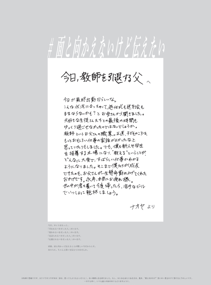 父子之间的爱大多不溢于言表,作为广告人的儿子借助报纸袒露了情感,给准备悄悄离职教师岗位的父亲刊登了一封慰劳信。随着信件的公开和“虽然不是当面,但还是想对你说”的宣传语,父亲教师生涯的最后一天,在儿子的爱、学生们与读者的祝福中圆满结束了。