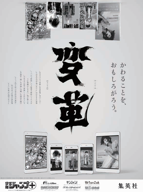 2020年令和的第一个正月,日本集英社在日本五大报刊上(朝日、每日、读卖、产经、日本经济)刊登了这组新年广告。报纸上下颠倒后,中间刚劲的黑体大字便会呈现不同的含义,些许带点中二的风格也展现了集英社面对新时代的热血和决心。