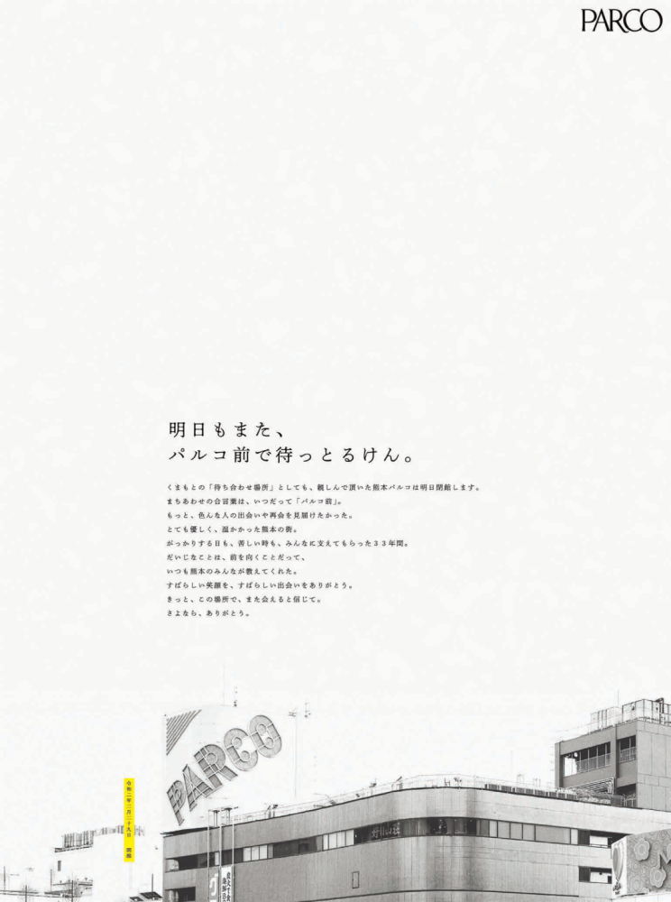 营业了33年的熊本PARCO,早已融入当地人的日常生活中,他们在分别时常说“明天也在PARCO等你哦”。在熊本PARCO倒闭前夕,通过报刊巧妙的向当地人传达了感谢与不舍之情。
