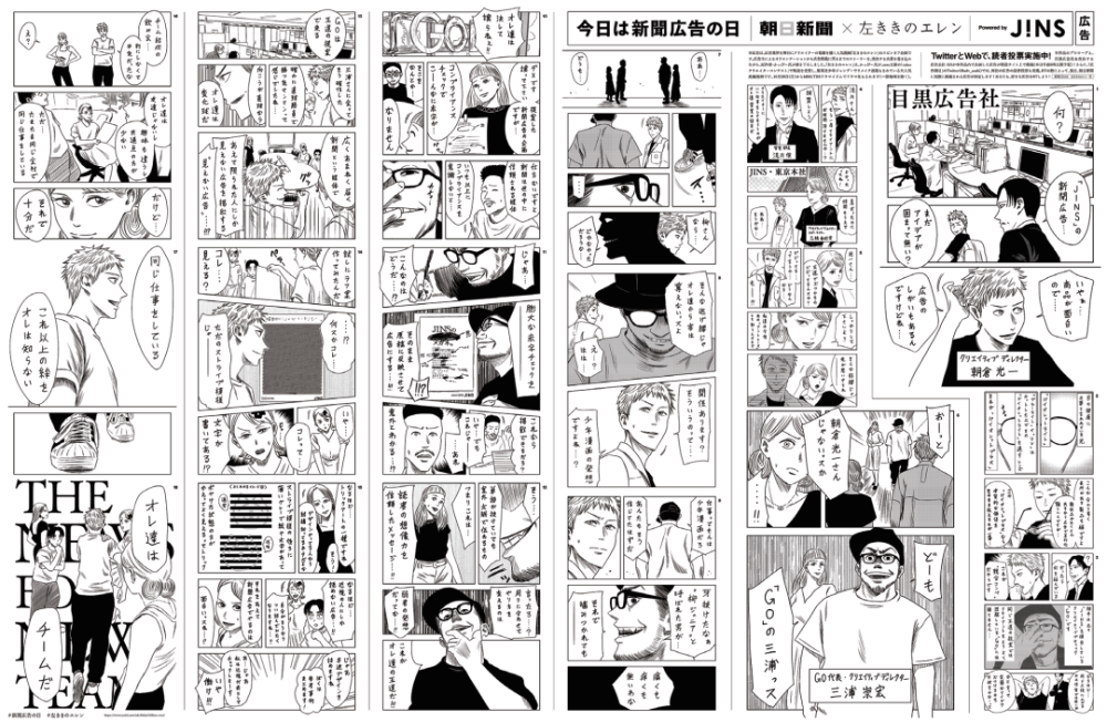 朝日新闻为配合10月20日的“报纸广告日”,策划了一个以广告业界为舞台的漫画专栏《左撇子艾伦》。漫画中的小故事里的企业和广告公司都是实际存在的,这种耳目一新的漫画形式不仅顺应了读者趋势,还颇具趣味的让读者了解了广告业内部。