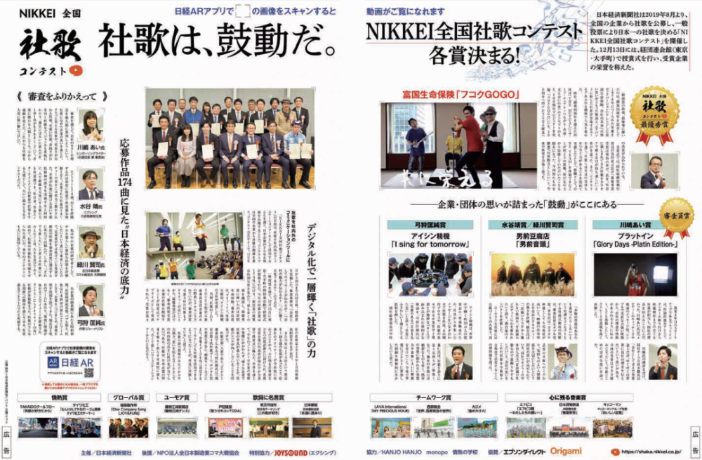 许多公司为了增强内部员工的凝聚力与积极性,纷纷推出了与公司相关的社歌。日本新闻经济社就此计划了一次日本公司社歌大赛。报纸还与“日经AR”相联合,读者可以直接通过报纸观看各企业的公司社歌并作出评选。