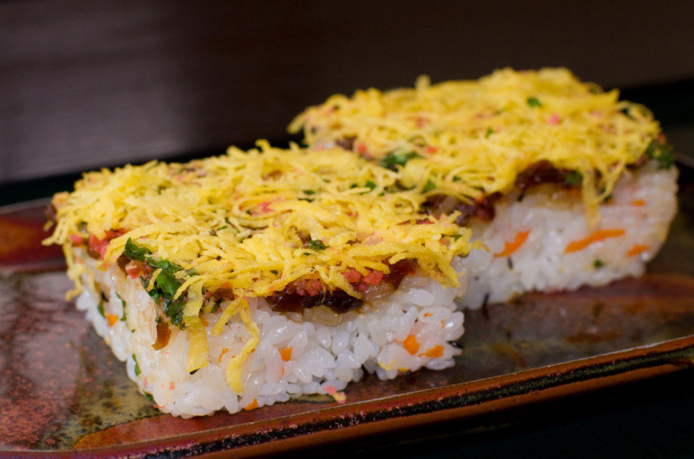 制作岩国寿司时会将醋饭和食材交替叠加,其高雅的味道和华丽的外观绝对会让人大为满足。