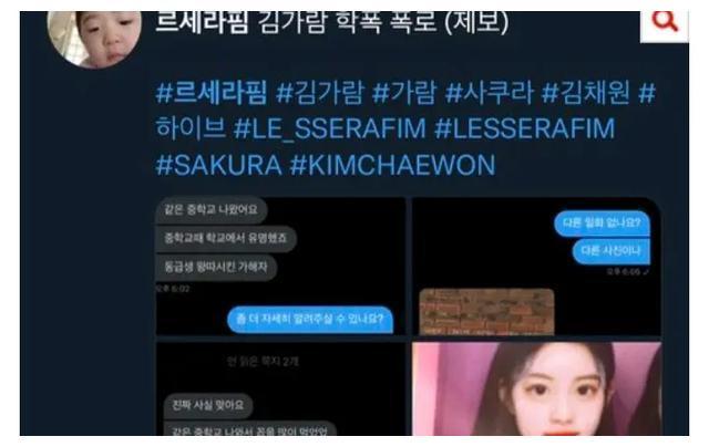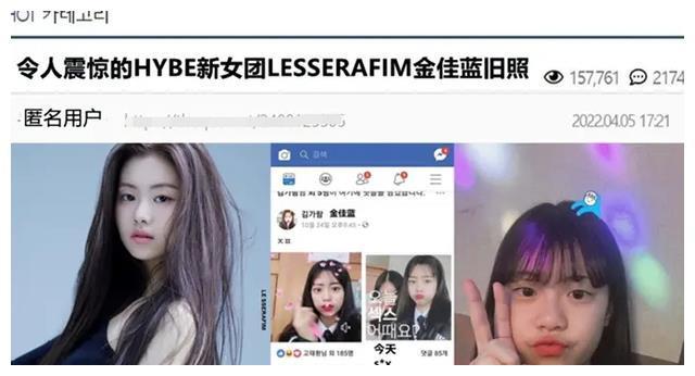 4月6日,HYBE的新人女团LESSERFIM突然在韩流登上各大热帖和趋势,不过这并不是因为她们人气高,而是第二位公开的成员金佳兰被曝出了黑料,从整容,到学校霸凌,再到不雅照片和出格的聊天记录,这位成员几乎到了被锤死的程度,最离谱的是她此前还因黑历史被IVE踢出了出道组,同组合的宫胁咲良和金采源受直接自闭。