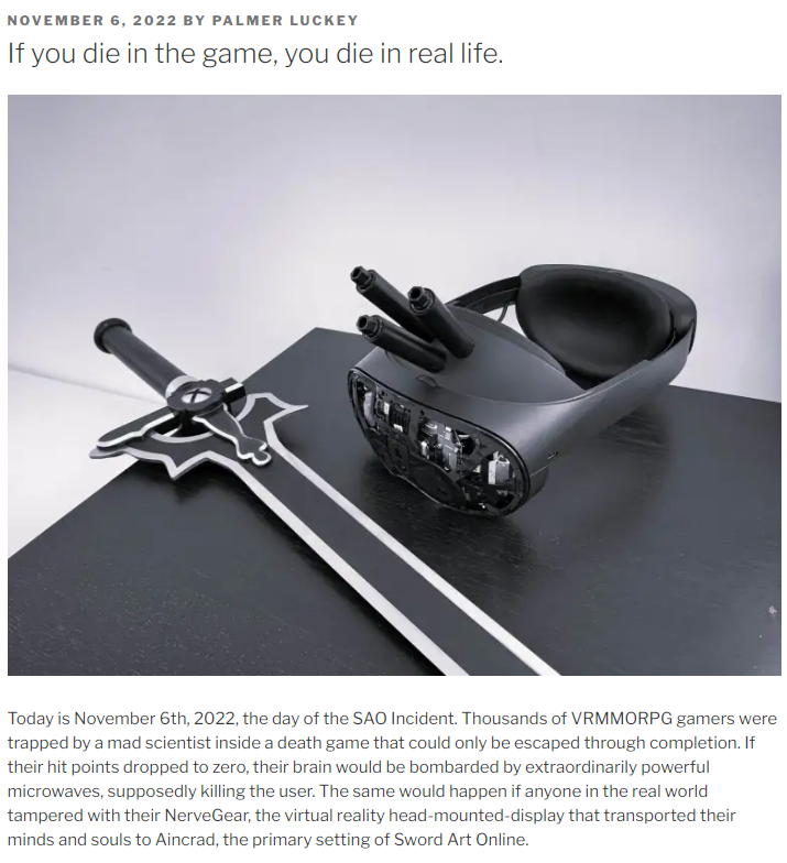 Palmer Luckey特意选在11月6日发表该篇博文,并开篇阐述了他以下行为的理由:动漫中,大量玩家被困在VR游戏Sword Art Online里,如果有人在游戏中死亡,那么现实中也会被名为NerveGear的设备杀死。而游戏SAO公测日,正是2022年11月6日。