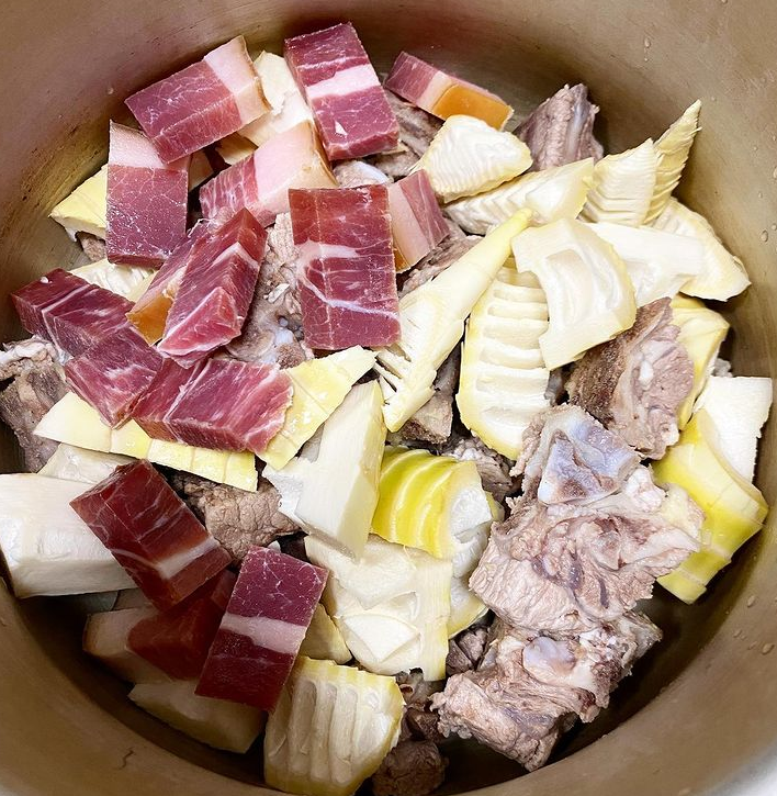 腌笃鲜的主角一定是应季的春笋,走钢丝一般跃到了最中央的舞台,挥动着嫩嫩的笋尖不住地平衡着鲜肉的喜感和咸肉的悲天悯人之处。这锅汤立刻变得灵动起来。