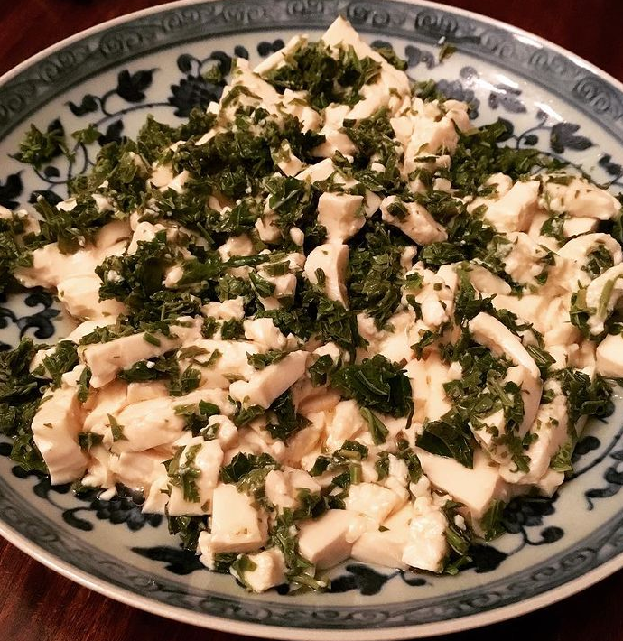 更简单的家常菜是香椿拌豆腐,香椿焯水切得细碎,跟豆腐一拌就能吃得满口清鲜。关键是浇上去的那一点点小磨麻油,起了画龙点睛之笔。