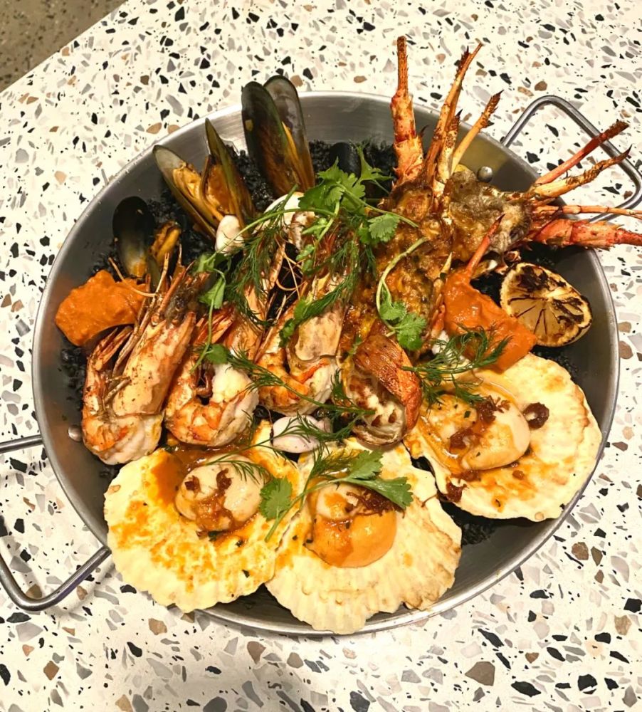 丰盛的海鲜拼盘端上桌来,每个人都不由“哗”声惊叹。硕大的烤盘被满满的海鲜淹没,整只越南龙虾、扇贝、青口、以及越南老虎虾覆盖在墨鱼烩饭之上。