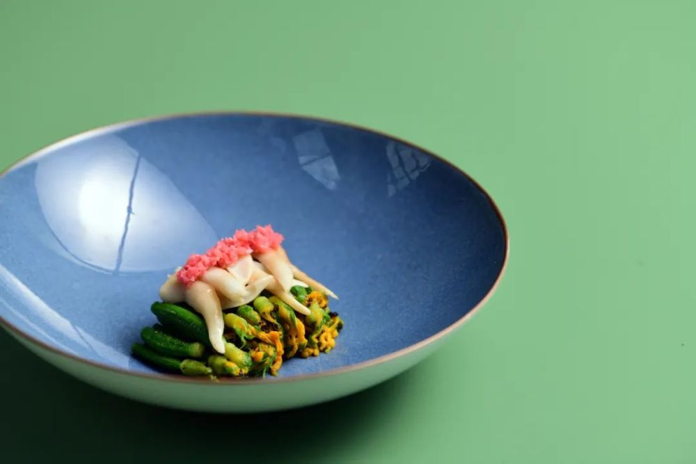 精选来自大连,辽南沿海的鸟贝,取贝肉稍加烫制,保持肉质脆嫩,口味回甘。搭配鲜嫩的黄瓜花,增加清新的口感。以松露酱与松露油调味,更添香味。咸鲜之中,清新的口感和浓郁的香味,令人感受春天的气息。