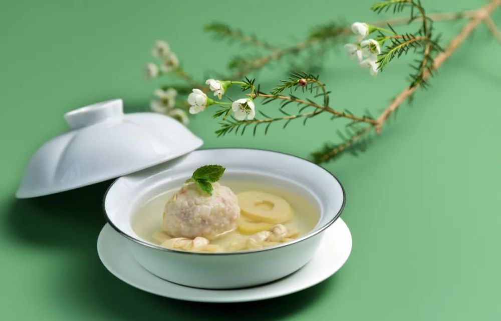 清汤腌笃鲜狮子头别出新意,以腌笃鲜原料做成狮子头,搭配清亮的汤汁。鲜肉的多汁、春笋的清脆、咸肉的丰腴揉和一体,呈现复杂的风味和多层次的口感。