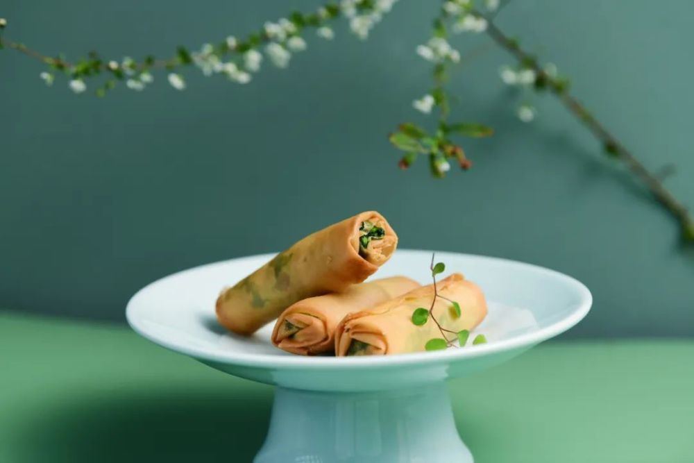 汪曾祺曾这样赞美香椿拌豆腐:一箸入口,三春不忘。搭配新鲜鲈鱼和鲟鱼籽,是田野之鲜与河海之鲜的相遇,带来多层次的鲜香,多样的口感。诸多食材以春卷皮卷起,精致小巧,包裹住春日的美味创意。