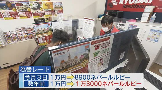 (Q:请问您在日本打工时做什么工作呢?)尼泊尔留学生说:“制作便当。我希望日元升值,现在的状况让我很心痛。”即使现在“日元贬值”,但很多外国人无论如何都必须给家人汇款。KYODAI博多车站前分行员工塔帕?卡维尔说:“之前有来自缅甸的客人办理汇款,发现汇率一下子降了这么多吓了一跳,但还是得给家人汇款。”