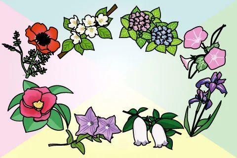插花时使用的花被称为花材,可按四季、颜色、叶子等再进行细分。另外,松柏等常绿树和外来物种与四季无关,全年都可使用。