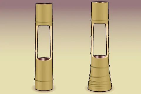 能在两个地方插花而制作的花瓶,叫作二重切;三个的叫做“三重切”。花器是竹子,有各种各样的切口,根据插花的地方不同,插花的方式也不同。