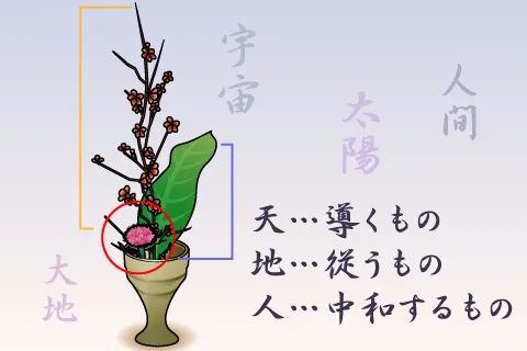将“天”(天体、太阳)、“地”(大地)、“人”(人类)用于插花,来表现宏伟的宇宙。