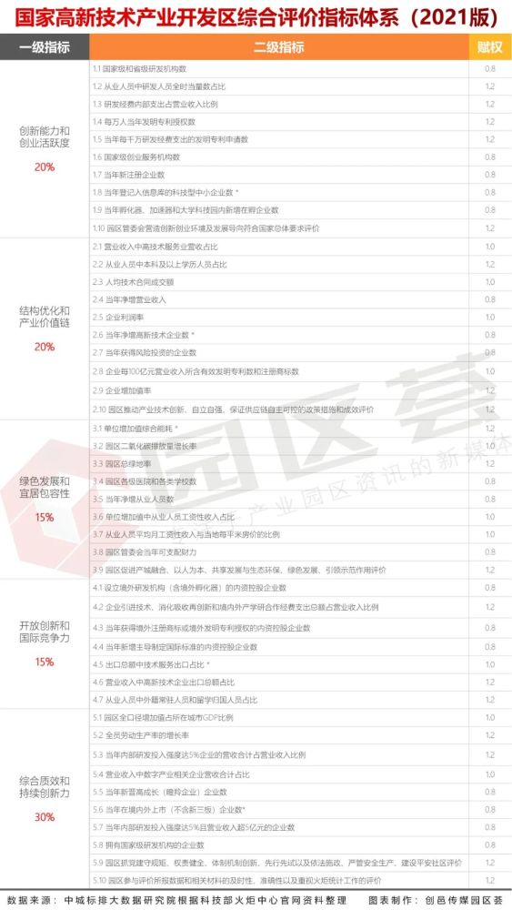 新评价体系主要侧重于园区创新能力和创新活跃度、结构优化和产业价值链、绿色发展和宜居包容性、开放创新和国际竞争力、综合质效和持续创新力5个方面。其中,“绿色发展和宜居包容性”首次出现,体现了双碳背景下的与时俱进。同时,绿色发展的前提是科技创新能力,结果是可持续发展能力,这项指标和老的评价体系其实是一脉相承。