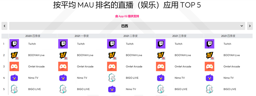 跟市场同类竞品相比,Nimo也逐渐站稳了脚跟。data.ai数据显示,Nimo TV在印尼、巴西、阿根廷等多个国家的MAU已经排进当地直播应用的前五名。