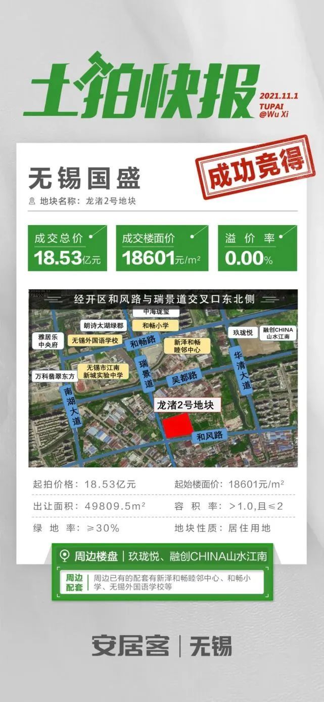 该地块为2021年11月1日,由无锡国盛竞得,成交楼面价为18601元/平米。