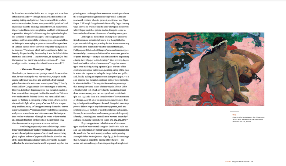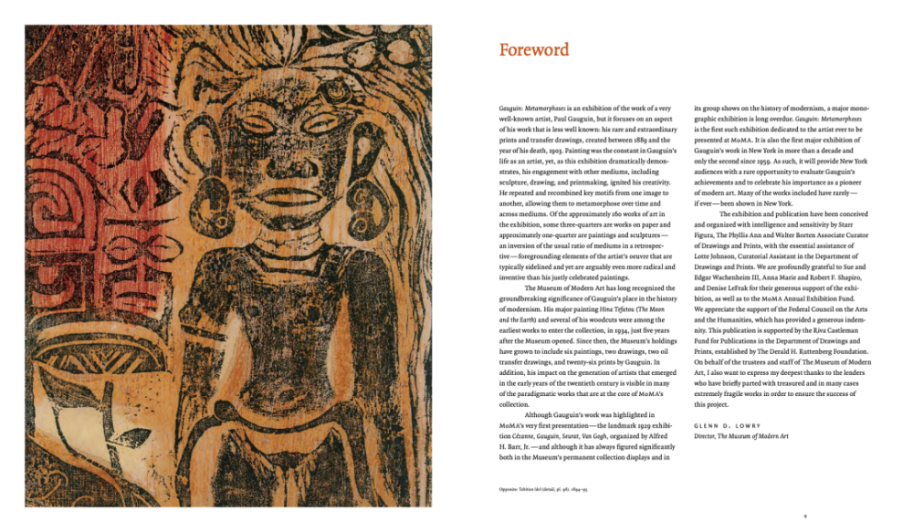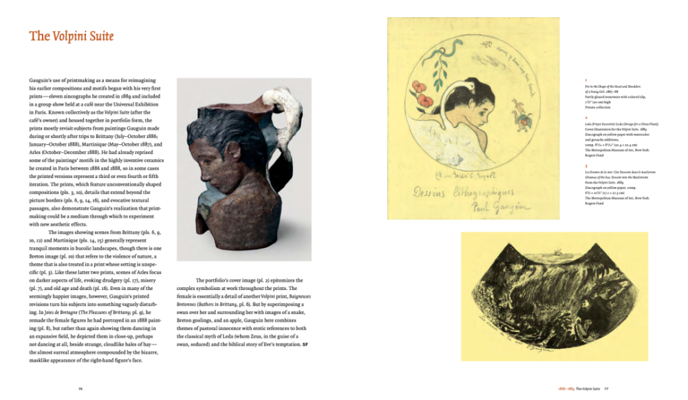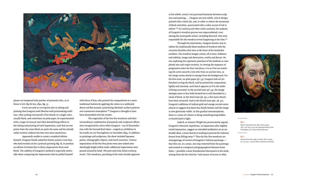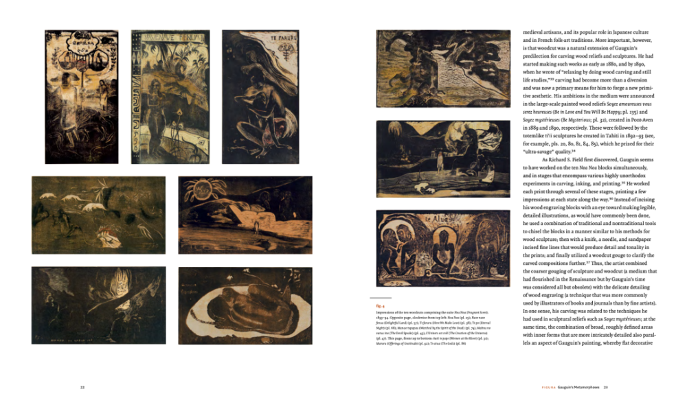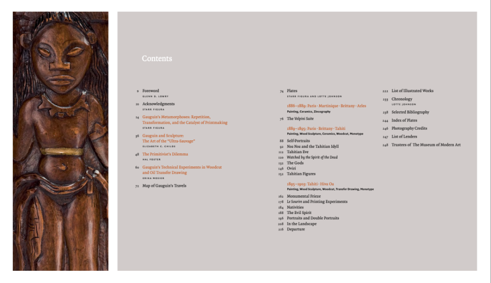 Starr Figura的一篇介绍性文章考虑了高更创新版画的意义以及他的版画与绘画和雕塑作品之间的关系;Elizabeth Childs写道:“高更的激进木雕作品,以它们为试金石,进一步研究他的周游实践;Hal Foster的文章讨论了高更的“原始主义”及其美学和文化含义;Erika Mosier的文章提供了一位保存人对高更不寻常的版画技术的见解。