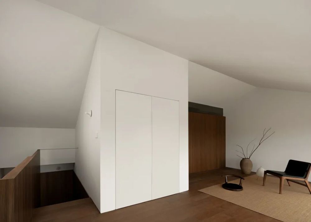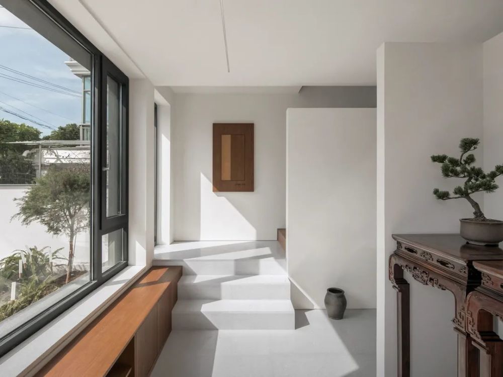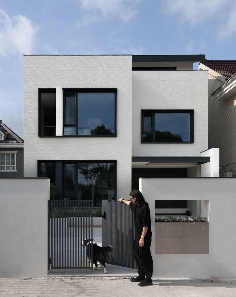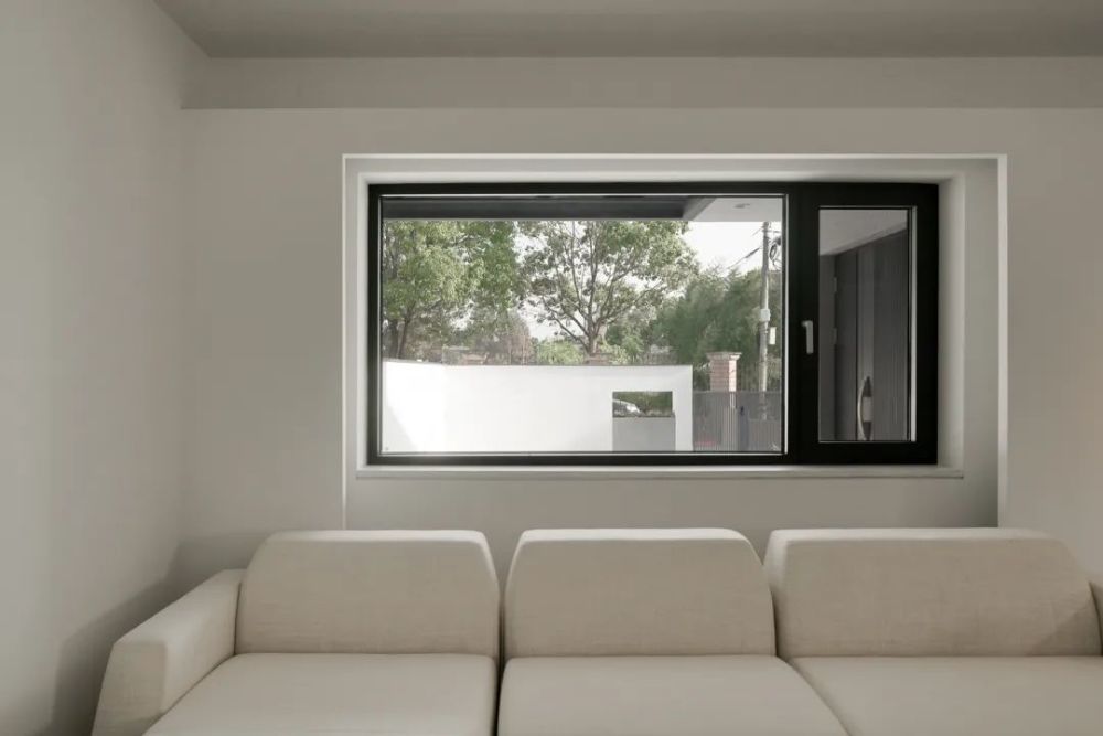 建筑外部希望他是安静内敛的,原外墙饰化铁艺围栏塑造了边界却没有场所感,开门见山直对大门,直接突兀。我们重塑了外墙,控制墙体的高度将外部不利视野进行隔绝,形成一个具有空间感层次感的独立小院,它是内向的。其次我们对外墙进行瘦身,去除不必要的装饰性元素,同时应对原始外墙自身保温防水老化等现实矛盾,选用具有耐久性自洁性的新型挂板材料给老宅穿上了“新衣”,新型挂板材料有效避免二次拆旧造成的资源消耗,同时干挂做法产生空气自循环层,有效提升老宅保温隔热性。同时原建筑形式化的屋顶,内部不具有正常使用尺度,形式大于功能,我们对其拆除重塑,调整为双向坡顶,产生一个真实使用的空间,最后我们应对外部景观及内部使用功能场景,重新梳理了门窗的关系,每一个开窗都如同画框,一步一景,在空间里产生丰富细腻的感受。