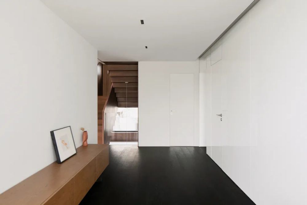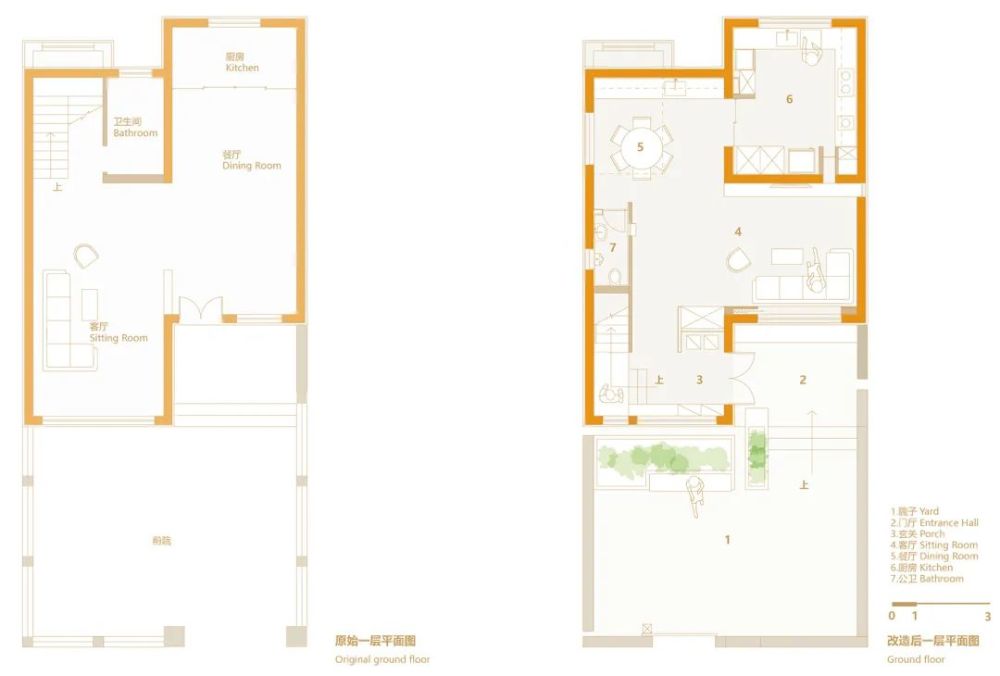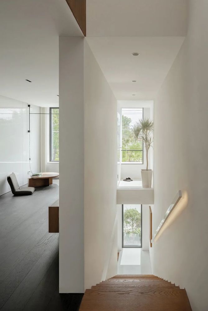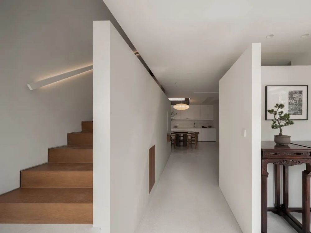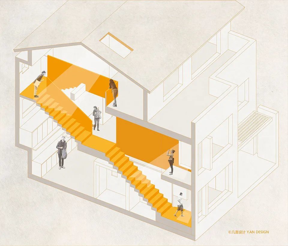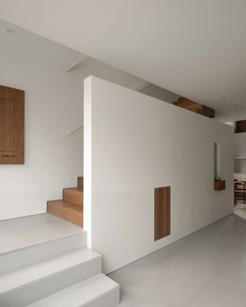 建筑内部希望他小有洞天,原始内部空间秩序不足,功能混合动线干扰没有逻辑,多楼层楼层平层切分,缺少空间交互。尤其是开门入户及楼梯的位置,对空间产生了直接的干扰,一楼卫生间也是严重浪费。设计师对空间功能流线重新梳理,动线重塑之后,一方面竖向维度,我们利用新生的楼梯结合自然天光引入塑造街巷交流体验空间作为空间的主轴,同时将多个层次不同的生活场景进行有效串联,另一方面水平维度我们思考各个功能场所最适化的感受,将多个空间的关联性及私密性通过片墙玻璃的手段进行模糊界定,保证空间的通透性与拓展性,同时产生既独立又互动的丰富生活场景 。