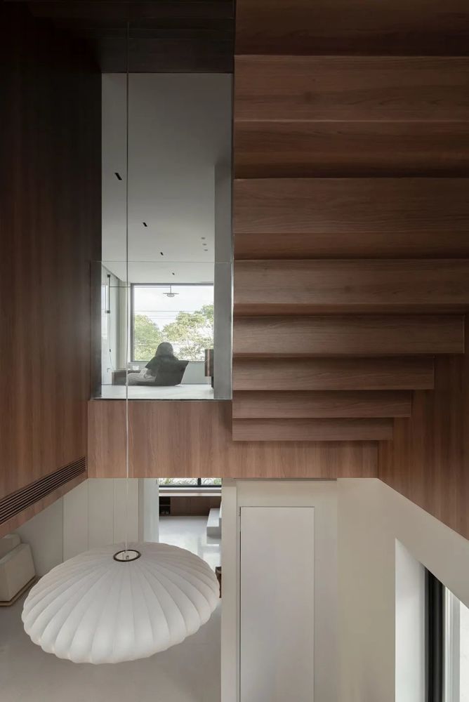 一楼,设计师通过对入户大门和楼梯起步的位子调整,我们营造一个具有光影景观的入户玄关主动线,同时切分出一个独立于空间主动线的的生活区,借助楼梯调整和卫生间储物间进行功能复合化,使得生活空间得到各大的自由度,获得水平自由度最大的横向大客厅,两层挑高体验的餐厅,超大操作空间的中西厨空间,得到各个功能区得最佳空间体验。空间里利用半高的墙体,墙体开窗,使得更大的空间拓展性上同时既独立又相互联系,产生一些趣味的小情景,借助半墙的空隙,让自然光渗透进内部,上下楼的时候可以与生活区相互视觉互动,透光墙体条窗,女主下厨的时候可以和客厅男主交互。