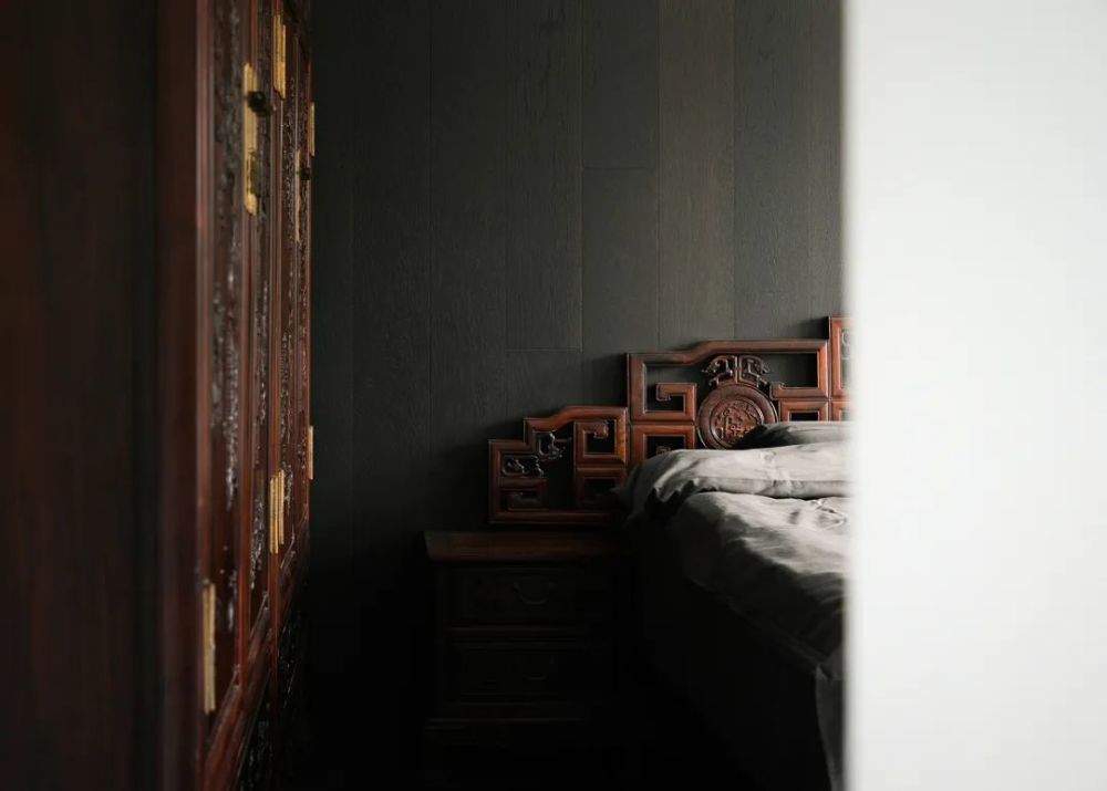 二楼是内向的起居空间,再空间里屋主保留祖辈传下的红木家具,我们选用深色的炭黑地板,加强空间的的底蕴,希望找到传统家具和现代生活的平衡。在“巷子”和就寝空中,我们利用空间余量创造了一个过渡空间,是这个家第二层次的起居空间,在这里可以阅读休闲互动 ,同时在楼梯平台上方,我们创造了一个独立的小阳台,将楼梯巷子的自然层次提升也是男业主的小天地。