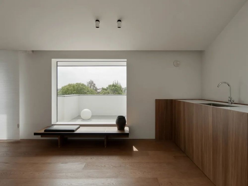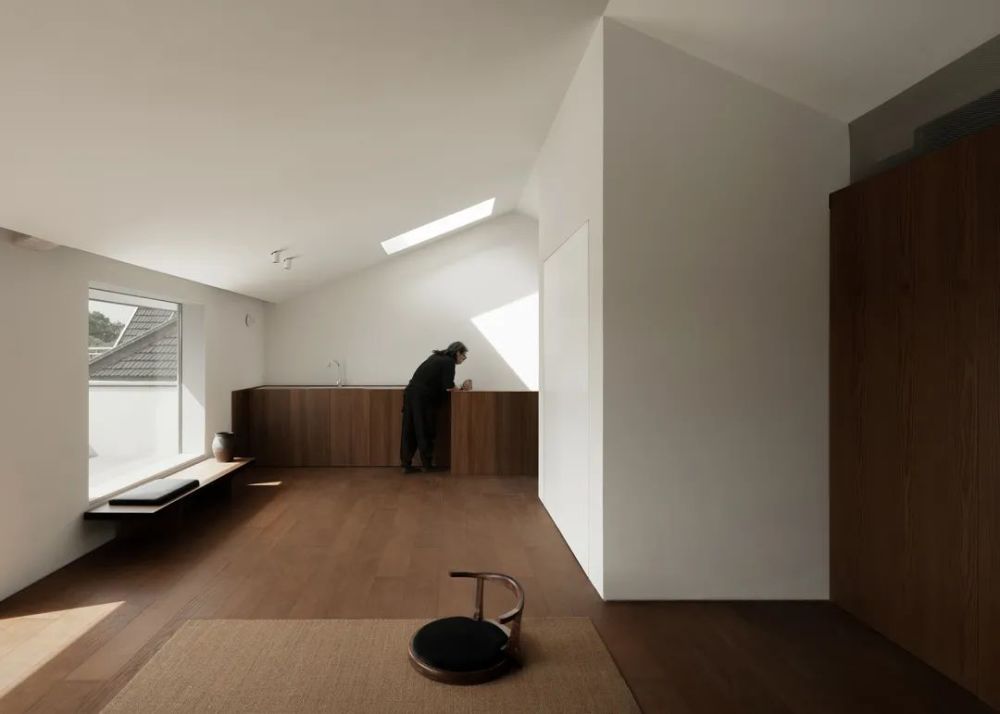 三楼是空间里最纯粹同时具有自然性精神性的场所,在这里我们尽可能的去除了多余的装饰性元素,屋檐的高度被降低加上自然天光的加入,它足够安静内敛,我们希望离景更近,离天更近,当你习地而坐的时候,眼前只有天空,树梢,光影,一切就感觉安静了。