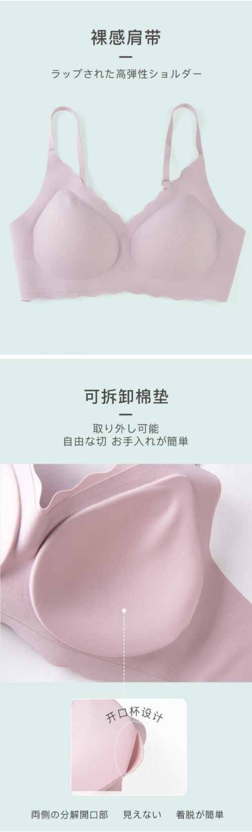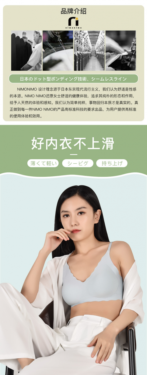 nimonimo内衣布料柔软舒适,如第二层肌肤包裹住女性的曲线,高度贴合的松紧程度,将肩部不再负重被勒,让光洁的背部不再出现束缚的红痕;高弹性塑形的设计,让人告别束缚不适的钢圈,远离滑肩掉的掉带的烦恼,展现最自然真实的女性之美;区别于传统内衣的色彩艳丽,以及为凸显性感和妩媚而设计的蕾丝等复杂细节,nimonimo无痕无尺码内衣,外观低调内敛,配色柔和,彰显女性简约、随性、舒适的理想自我追求。