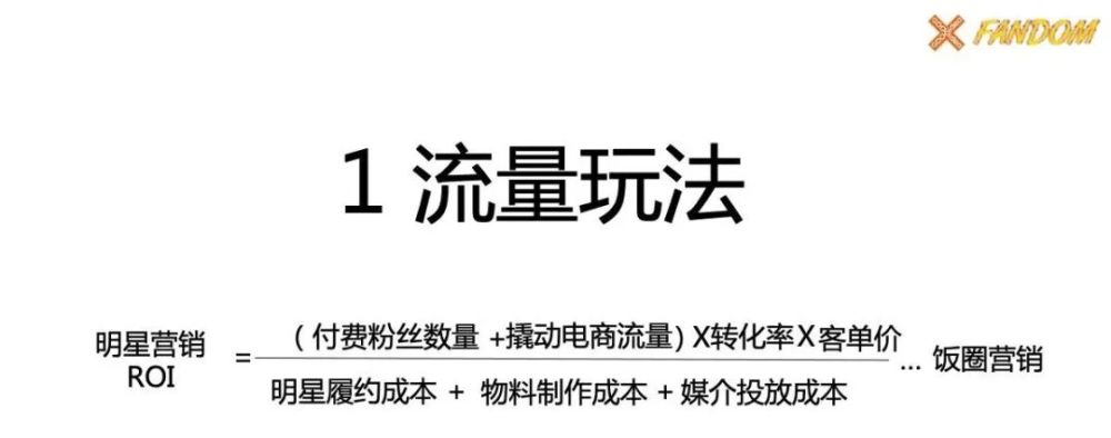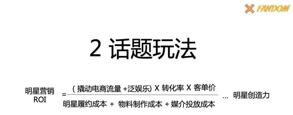 这种方法的成本项包括明星的履约成本、物料的制作成本,媒介投放成本;对应的收入项分别为付费粉丝的数量撬动的电商流量、电商的转化率是多高、客单价。