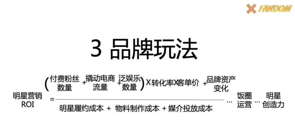这种玩法的成本项还是一样的,在收入项上,增加了泛娱乐的数量,甚至要有路人的数量。此外,品牌资产也是一个重要的变化,因为明星带来的影响力能否成为品牌资产的一部分,这对品牌来说是更长期的价值。