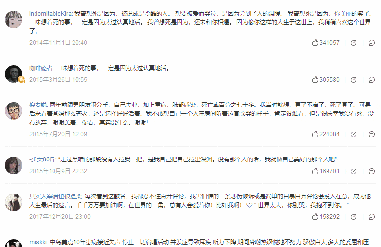 每条评论都隐藏着敏感脆弱却又勇敢的鲜活灵魂,大家在诉说各自人生中的至暗时刻,彼此倾诉着这首歌带给自己的力量、互相取暖。