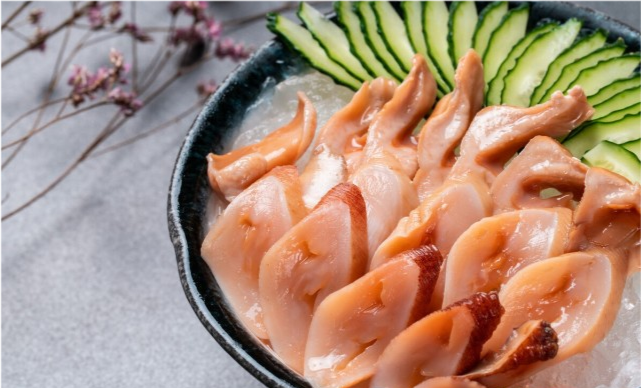 白灼象拔蚌是广东的特色名菜之一。选用鲜嫩的象拔蚌,洗净后切片,放入沸水里,立马捞出来装盘,蘸料吃。