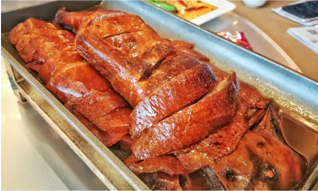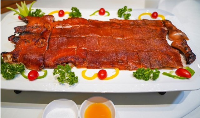 烤乳猪是广东省的特色名菜。烤乳猪是选用幼嫩的乳猪作为原料,经过烤制后的乳猪外皮焦黄诱人,吃起来的口感:外脆里嫰,非常好吃,乳猪的猪皮经过烤制变得非常酥脆可口,一点也不腻口,真非常值得尝试的一道名菜。