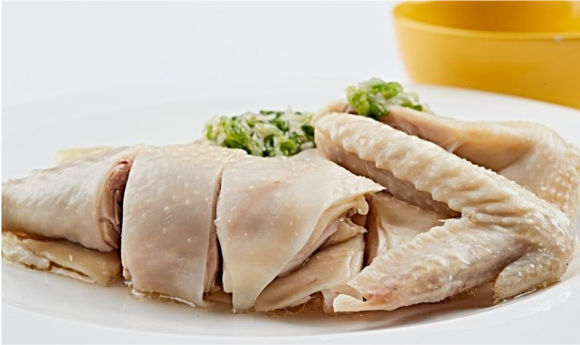 白切鸡是广东最出名的一道名菜,是用新鲜整只鸡处理好洗净后,放入沸水里浸烫,煮沸后,每隔5分钟将鸡提起来一次,倒出鸡腹腔里的汤水,反复两到三次,目的是让鸡腹腔内外受热一致,最后提起来,放入冷水里浸泡,让鸡皮的颜色非常漂亮,再把鸡放入沸水里烫5-8分钟,把鸡提起来放入冷水里浸泡后,拿出来切成小块装盘,蘸上料汁水就可以吃了。