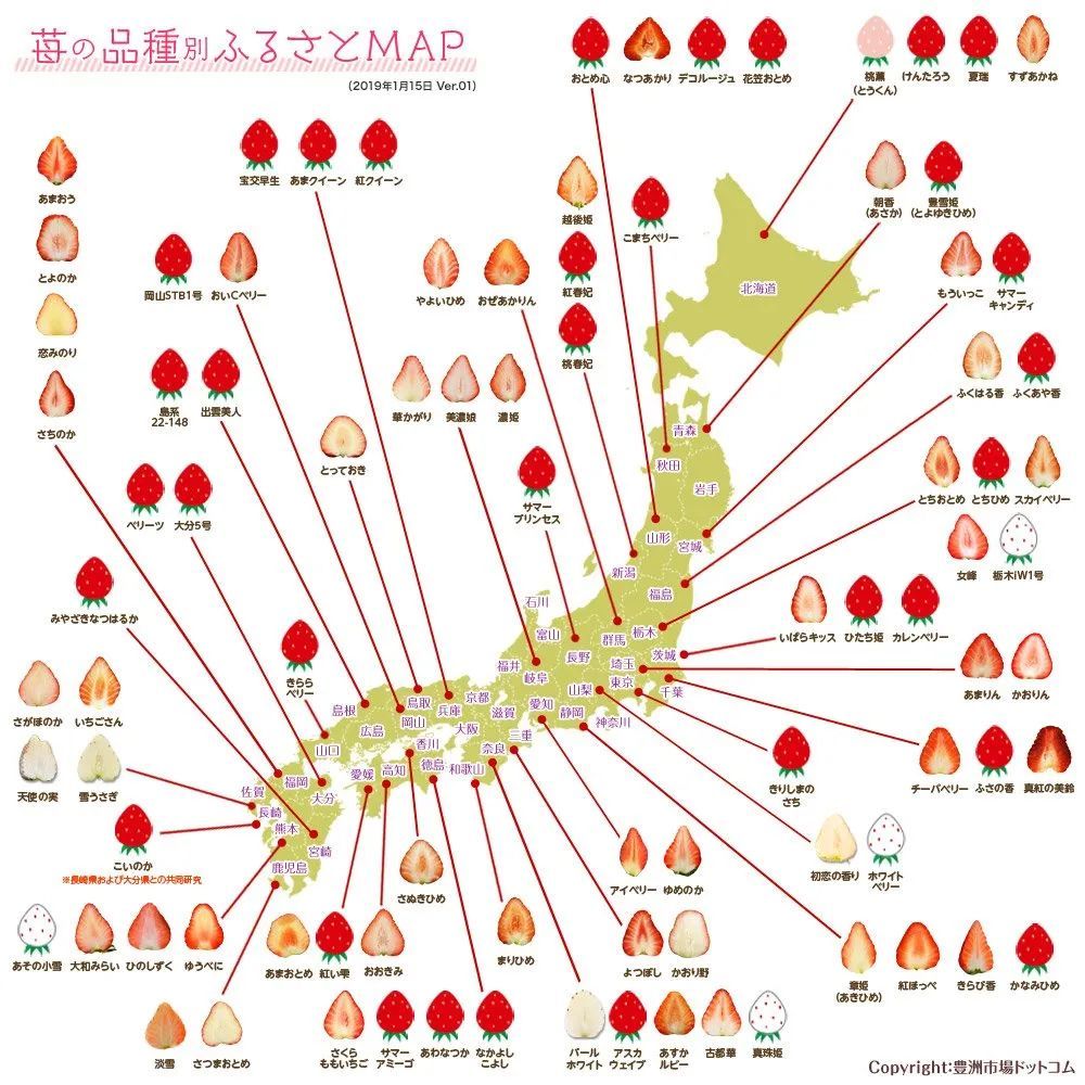 根据日本农林水产省所提供的草莓品种数据显示,目前日本的草莓品种约有300多种。其47个都道府县几乎都有属于该地区额改良草莓品种,其中不乏我们能轻松叫出名字的实力老将和流量明星,比如红颜、天使果实等。