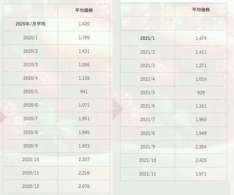 从图中可以看到,2020年11月草莓2216日元的售价还比2021年的1971日元贵了250日元。