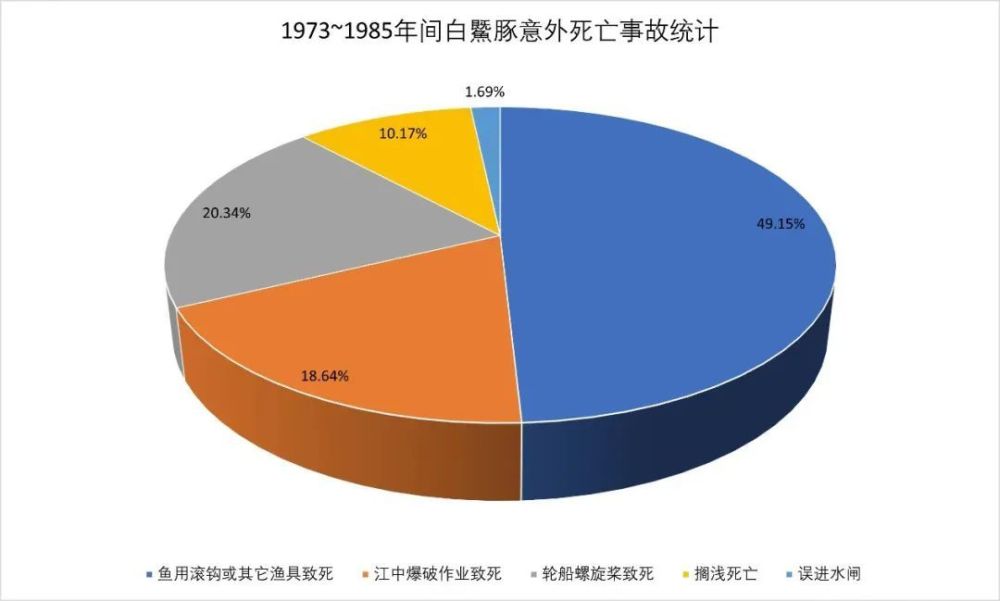 在我查阅到的资料中有一份指明了人类活动增加或活动不当造成白鱀豚意外死亡事故的统计数据,可以看到人类捕捞造成了近半的意外死亡,而在经济活动频繁的长江下游水域,有三分之一是被轮船螺旋桨打击致死的。这还仅是直接死亡的事故数据,事实上,人类对其食物鱼虾进行过度捕捞、对白鱀豚的栖息地的干扰和破坏、长江水质受到严重污染,都对这一物种带来了更为严重的间接伤害。与白鱀豚类似,长江江豚也在承受着人类活动造成的意外死亡,2001年以来,有10头江豚死于被船舶螺旋桨打伤、因水质环境污染而中毒身亡和被钩子挂伤而死等原因。