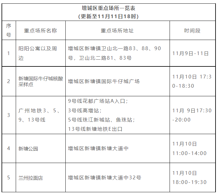 11月11日,增城区在省外来穗重点人员核酸检测中发现1名核酸检测异常人员。昨晚,增城疾控提醒:因疫情防控需要,请有以下时空交集的市民,立即向所在社区(村)报备,自觉开展“三天三检”自我健康监测,在24小时内主动到就近核酸检测点检测,并做好健康管理,落实个人防护措施。重点场所名单见下表,后续将按实际情况更新。