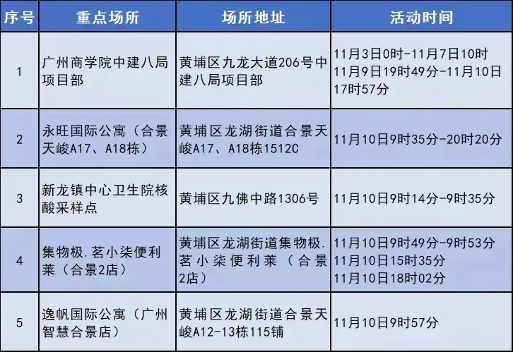 11月10日,广州市黄埔区龙湖街道在外区返埔的重点管控人员和已管控的密切接触者筛查中,各发现1例核酸检测异常人员。经初步流调核实,涉及黄埔区重点场所5处(详见附表)。黄埔区新冠肺炎疫情防控指挥部已立即启动应急响应,组织开展了区域管控、流调排查、核酸筛查、转运隔离、场所消杀等工作。